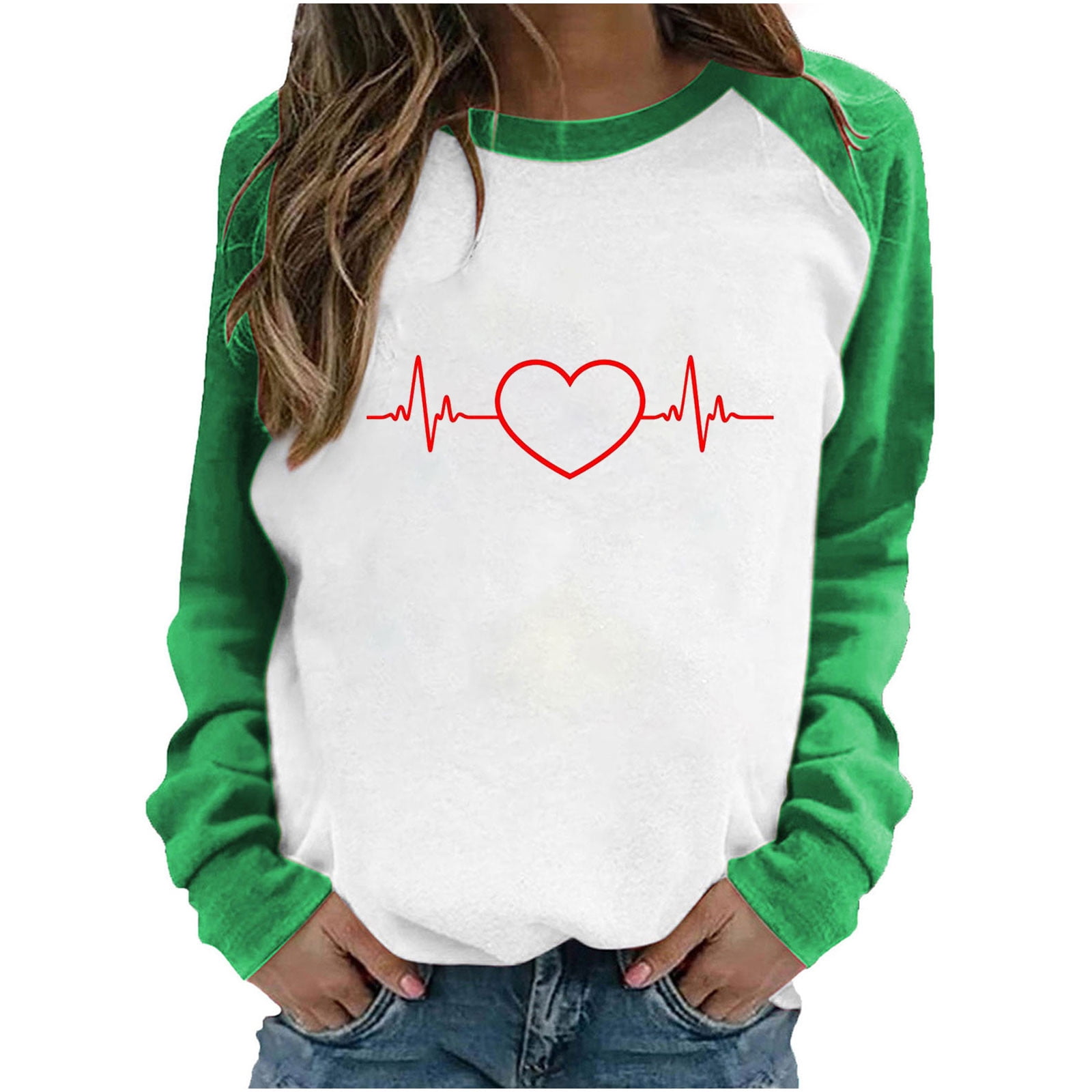 Cobkk Womens Tops Fancy Long Sleeve Round Neck Blouses Shirts Women S Spring Patchwork Letter Printed Long Sleeves Round Neck Casual Tee Tops Womens Blouse Work Green Print Flowy Love Heart Shirt